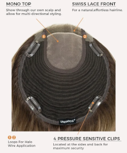 The Upgrade Courtney features a lace front and mono top base combination, which is perfect for diverse styling preferences. It also offers a generous base size that ensures the topper hair blends seamlessly with your bio hair, even at the back of the head. Thanks to the extended lace, a lace front provides the most realistic and natural hairline. However, the lightweight lace can also lift easily. To ensure the topper remains secure and maintains a natural look during activities like exercise, many people choose to use glue to help keep the lace front in place.